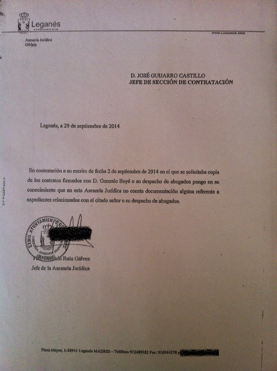 El pasado 2 de septiembre, el jefe de sección de contratación del Ayuntamiento, Don José Guijarro, solicitó al departamento de Asesoría Jurídica los documentos relacionados con la contratación de Boyé. Pasados 27 días llegó la respuesta a su despacho.