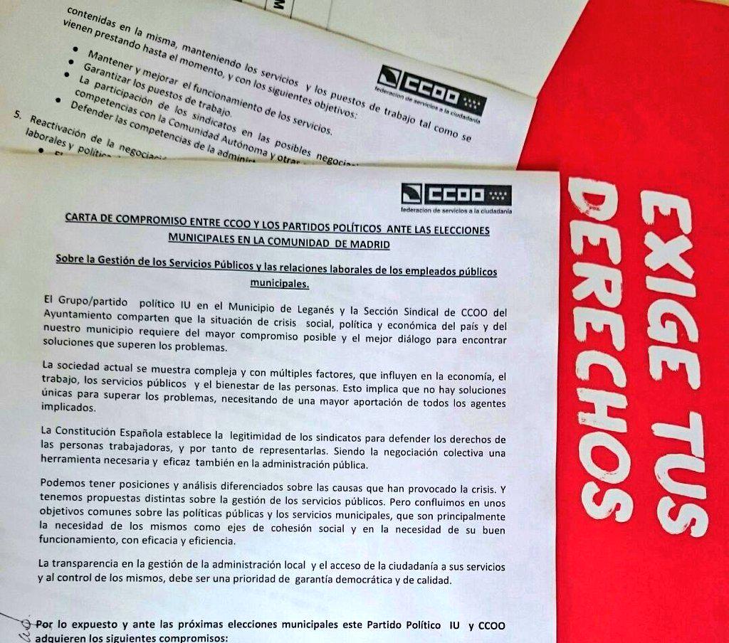 El pasado jueves, el sindicato de CC. OO. anunció la firma del compromiso para la defensa de los servicios y los empleos públicos por Izquierda Unida. El documento, que fue enviado el pasado mes de noviembre a todos los grupos políticos, recoge la exigencia de mantener una gestión directa de los servicios, impidiendo las privatizaciones «totales o parciales«.