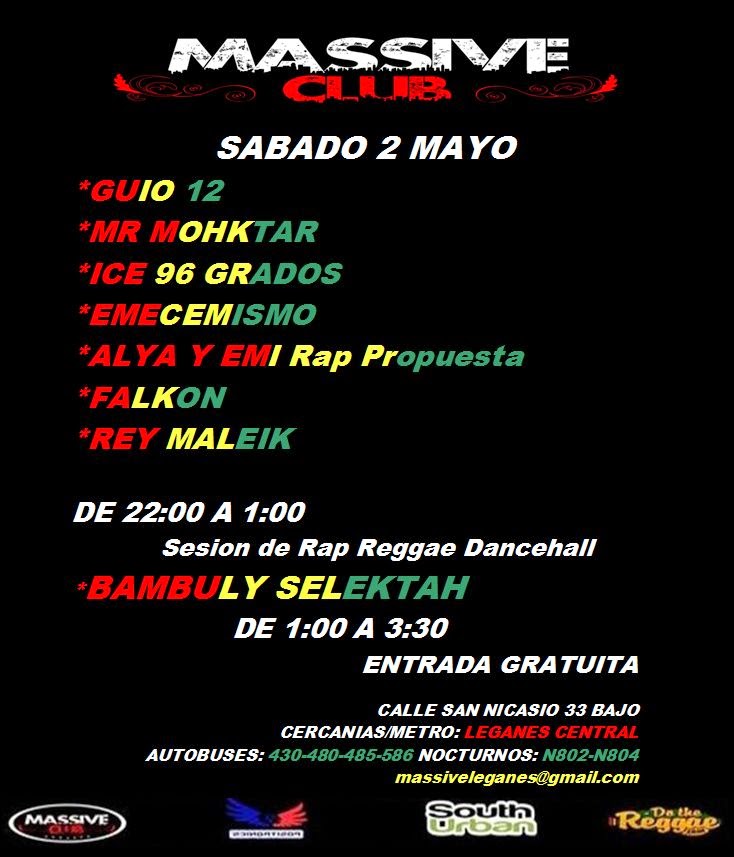 – Massive Club de Leganés presentará una sesión de Rap, Reggae y Dancehall de 22:00 horas. La entrada es gratuita. Bambuly Selektah, Mr Mohktar o Falkon, entre otros, estarán presentes en esta sesión de música alternativa.