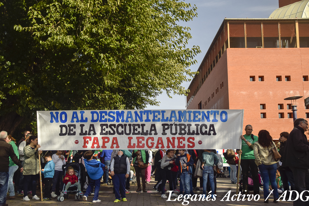 Desde las 11 de la mañana, el campus de la Universidad Carlos III de Leganés fue el punto de encuentro. Decenas de colectivos acudieron allí para congregarse en la comitiva que recorrería las principales calles de la ciudad. La FAPA de Leganés, los AMPAS de Concepción Arenal y Rafael Frübeck de Burgos, familias de las escuelas infantiles y decenas de alumnos de todas las etapas educativas formaban parte de la marcha.