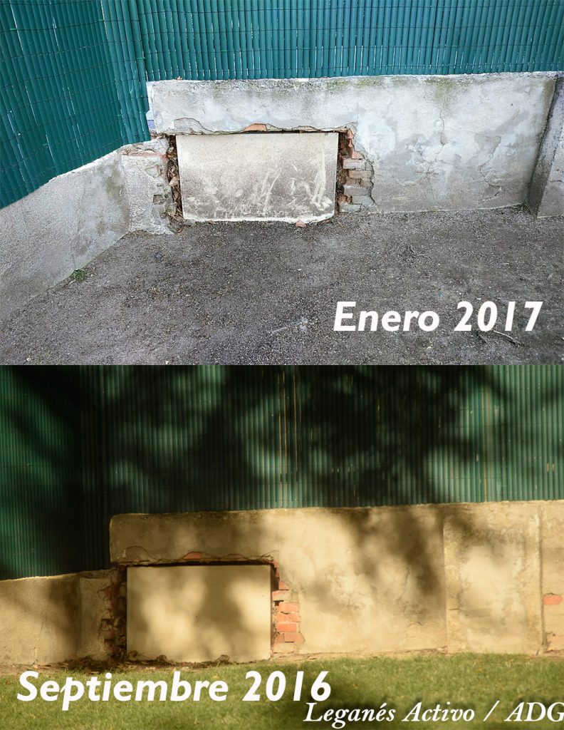 Por otro lado, en septiembre el AMPA denunció la falta de mantenimiento en el centro. Desde Leganés Activo pudimos comprobar la situación de las instalaciones. Tras las numerosas denuncias, el Ayuntamiento aseguró haber solucionado los problemas. Cuatro meses después, continúan igual. El muro perimetral tiene agujeros y caída de cascotes, el alcantarillado se obstruye por las hojas y la arena y las raíces de los árboles provocan desniveles.