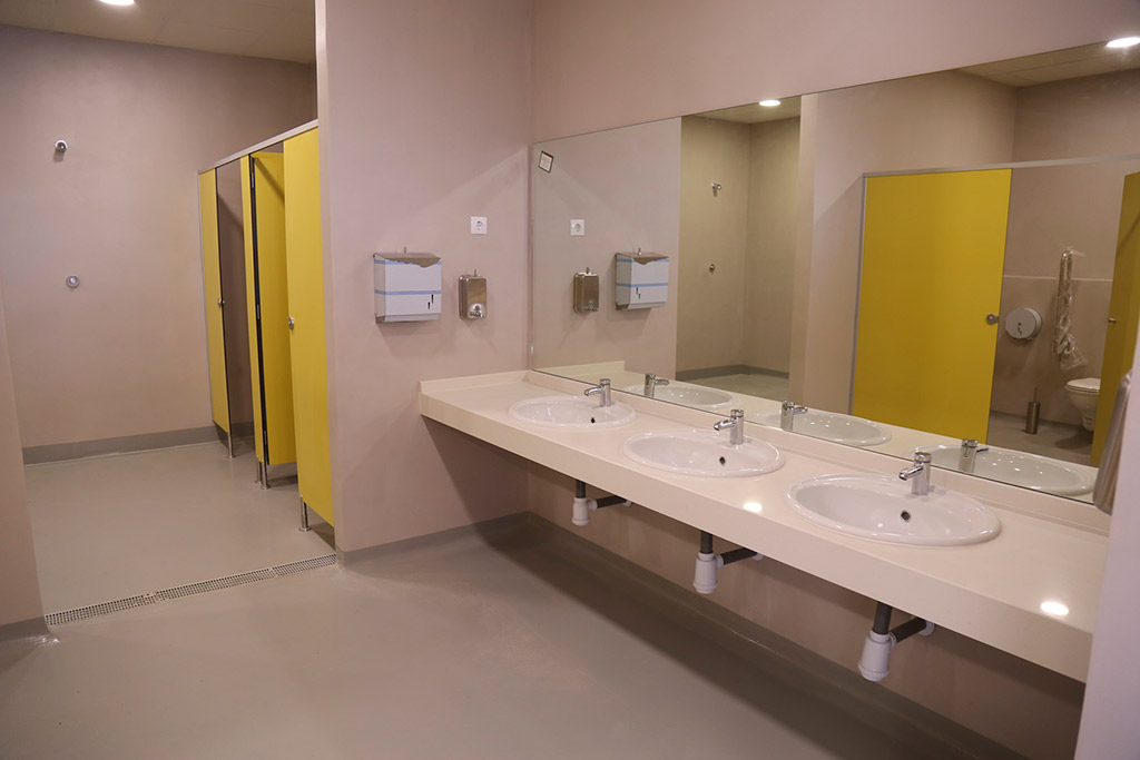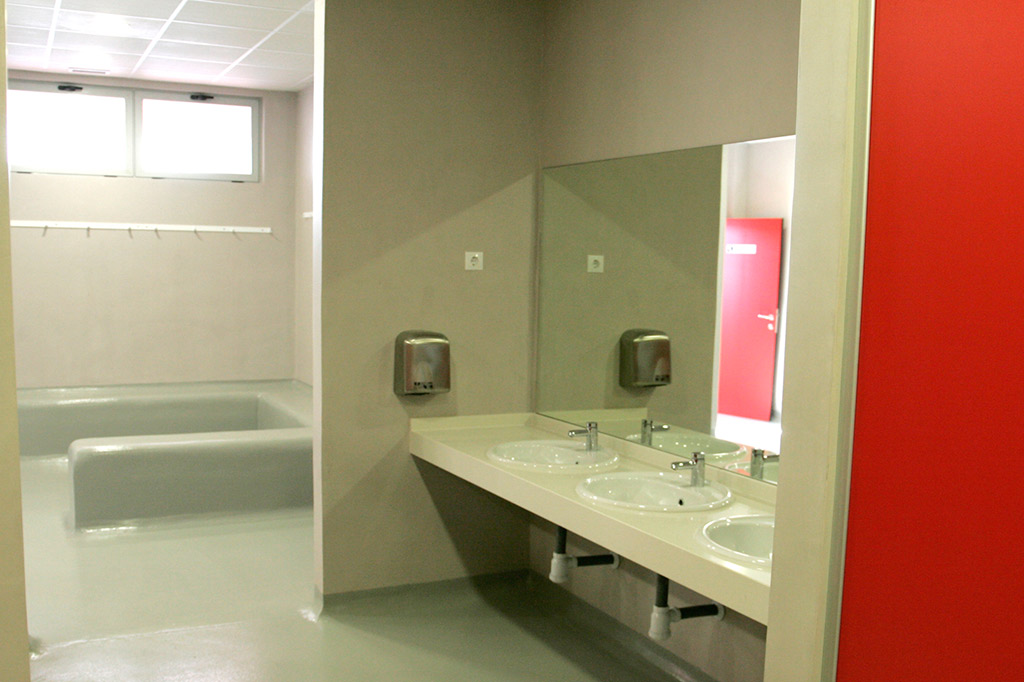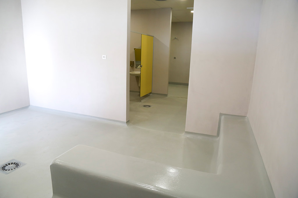 La mayor parte de la instalación cuenta con solados de resinas epoxĆdicas. Se trata de un material antideslizante que garantiza ademĆ”s una mĆ”xima higiene. Los paramentos verticales tienen un acabado de microcemento, material muy resistente, impermeable y que se limpia con facilidad.