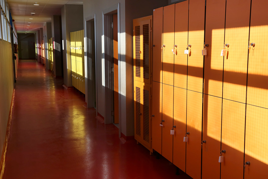 La zona central común da acceso a los vestuarios y despacho de Ôrbitros. La instalación dispone ahora de vestuarios masculinos y femeninos para el personal de la instalación, cuartos de almacenamiento y de limpieza.