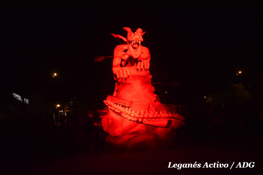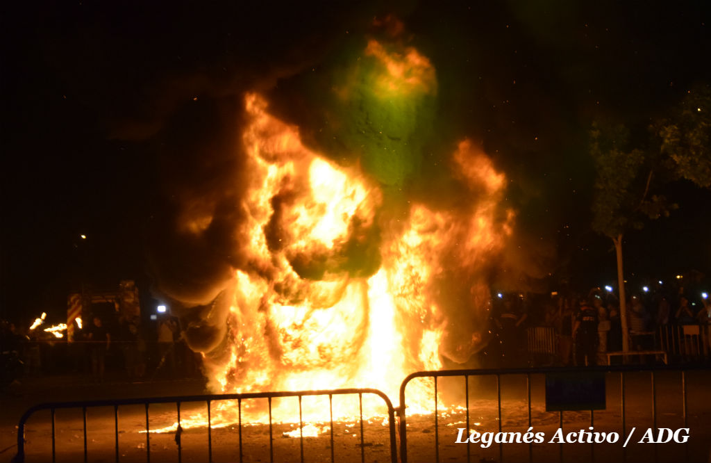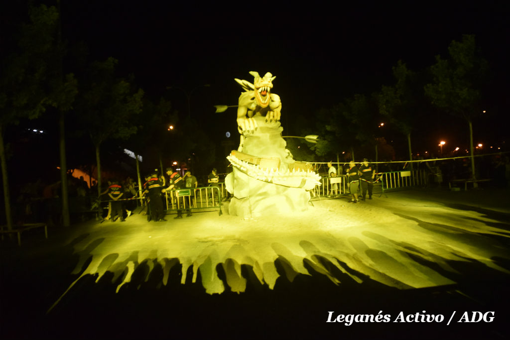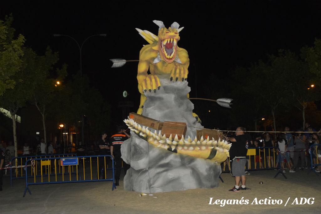 Minutos más tarde de la medianoche, el desfile de antorchas portadas por motoristas llegaba a la estatua. El alcalde, Santiago Llorente, fue el encargado de prender la pirotecnia que envolvía la figura. Una primera explosión sorprendía a los presentes y comenzaba la cadena. Segundos después el dragón, envuelto en pirotecnia y gasolina, se convirtió en una bola de fuego, humo y cenizas en medio del asombro y la admiración de los vecinos y vecinas que se agolpaban en las vallas.