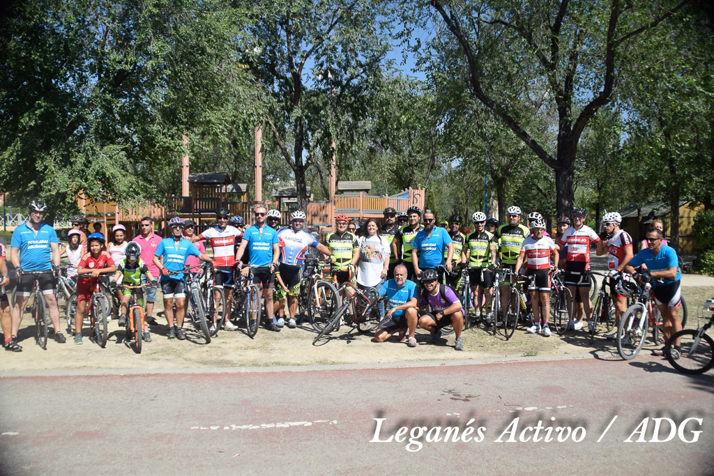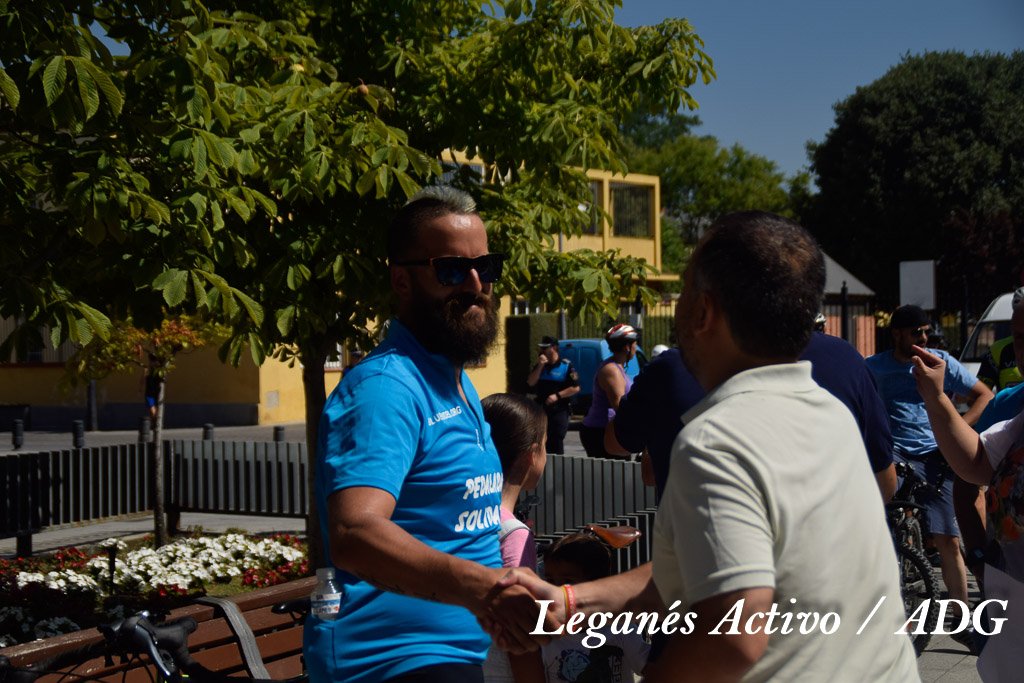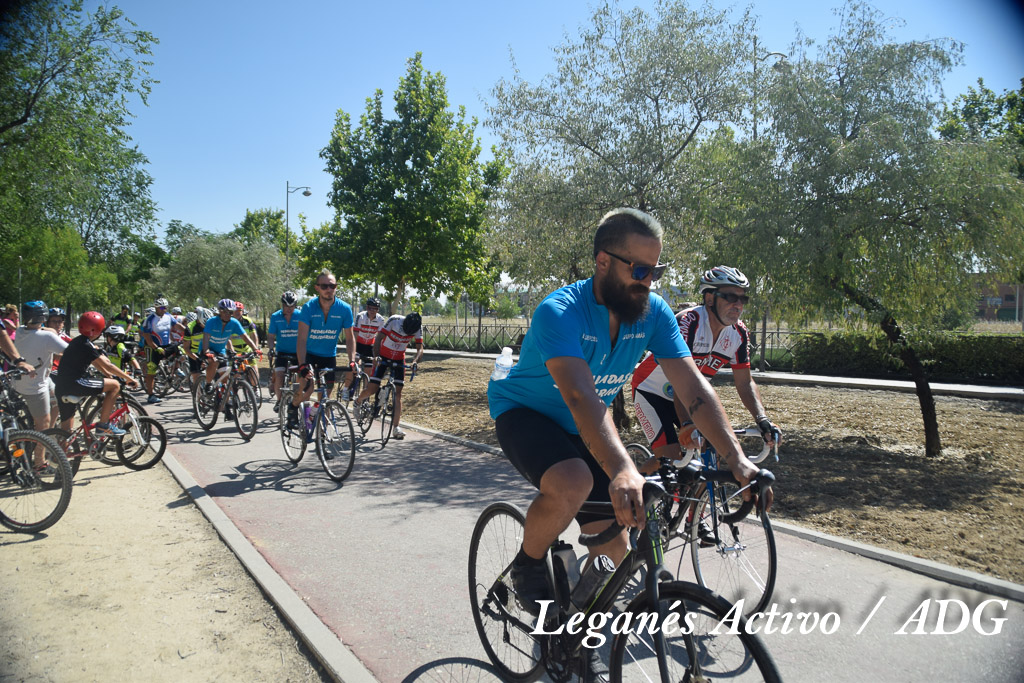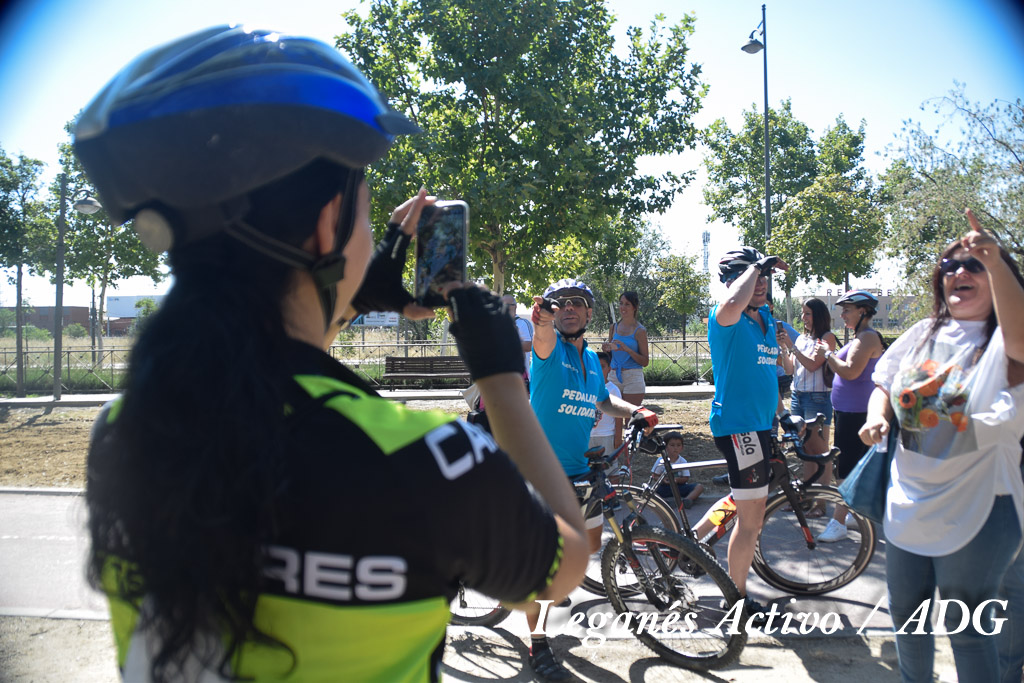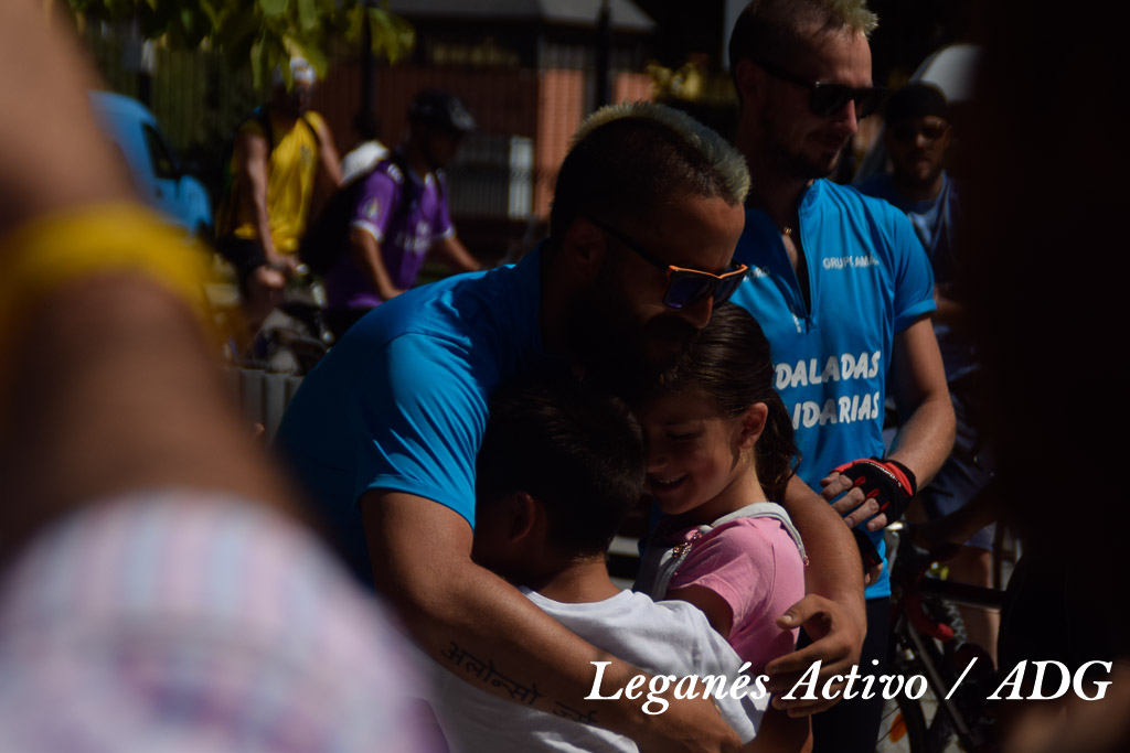 BlueRides Leganes Cardiff-1109Eran las 11:45h cuando Arturo y Monkey, después de 13 etapas, eran recibidos en el parque El Carrascal entre aplausos. Era la primera parada en Leganés. Allí, alrededor de cincuenta ciclistas les esperaban para acompañarles en la recta final. Familia, amigos y miembros de La Peña Ciclista Bermejo, el Grupo BTT Vinagres Leganés y del Grupo AMÁS, les esperaban.