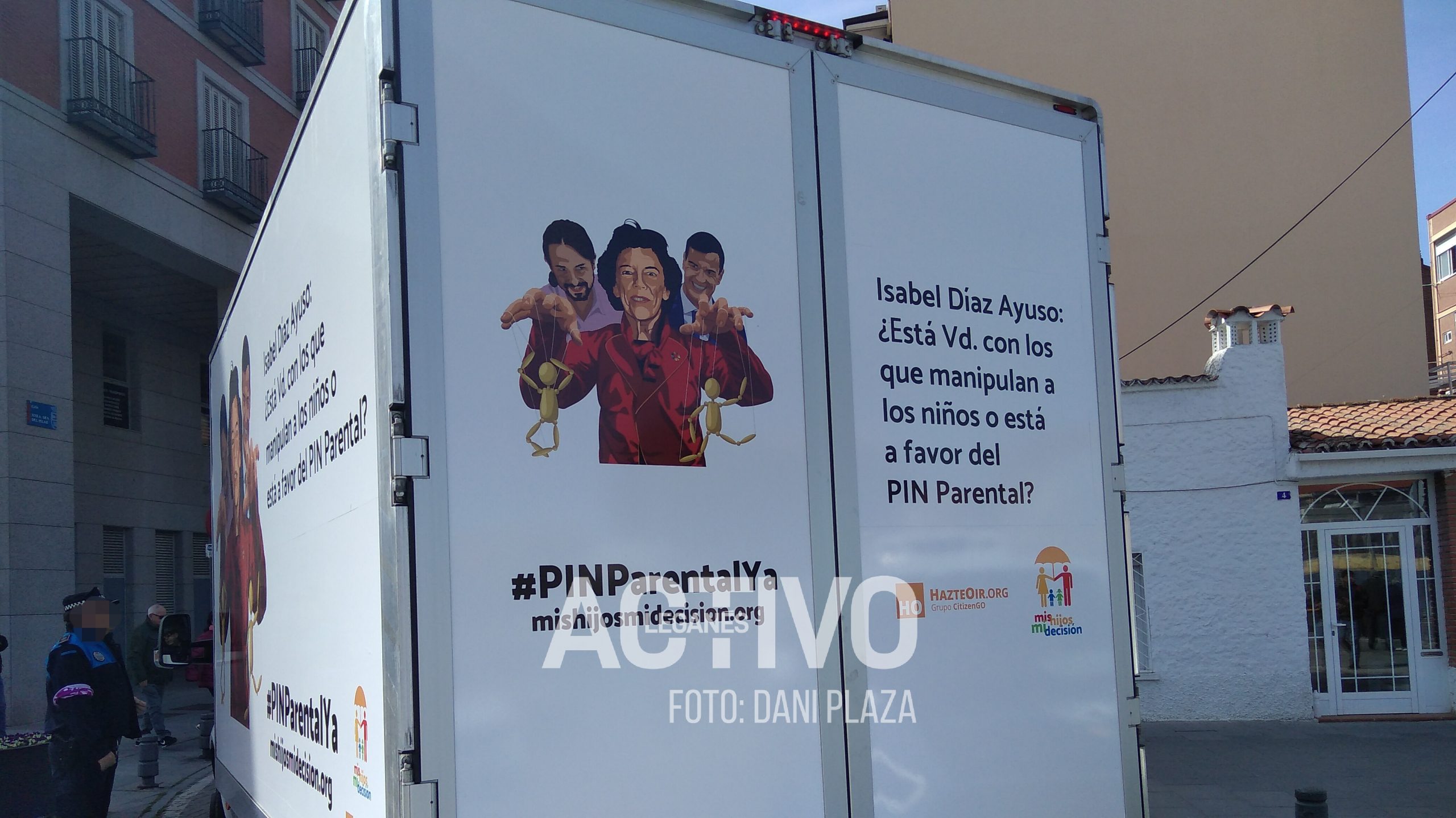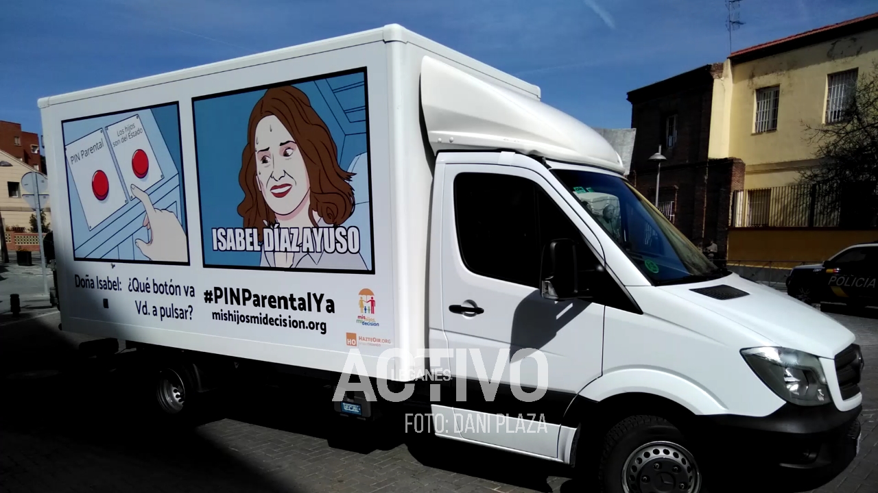 En un nuevo intento de presión para instaurar el ‘pin parental’ en los centros educativos leganenses, el grupo ultraconservador decidió utilizar camiones para visibilizar sus reivindicaciones. Las personas que se encontraron esta peculiar manifestación en la glorieta no daban crédito e incluso se preguntaban sobre la legalidad de circular con los mensajes que portaban.