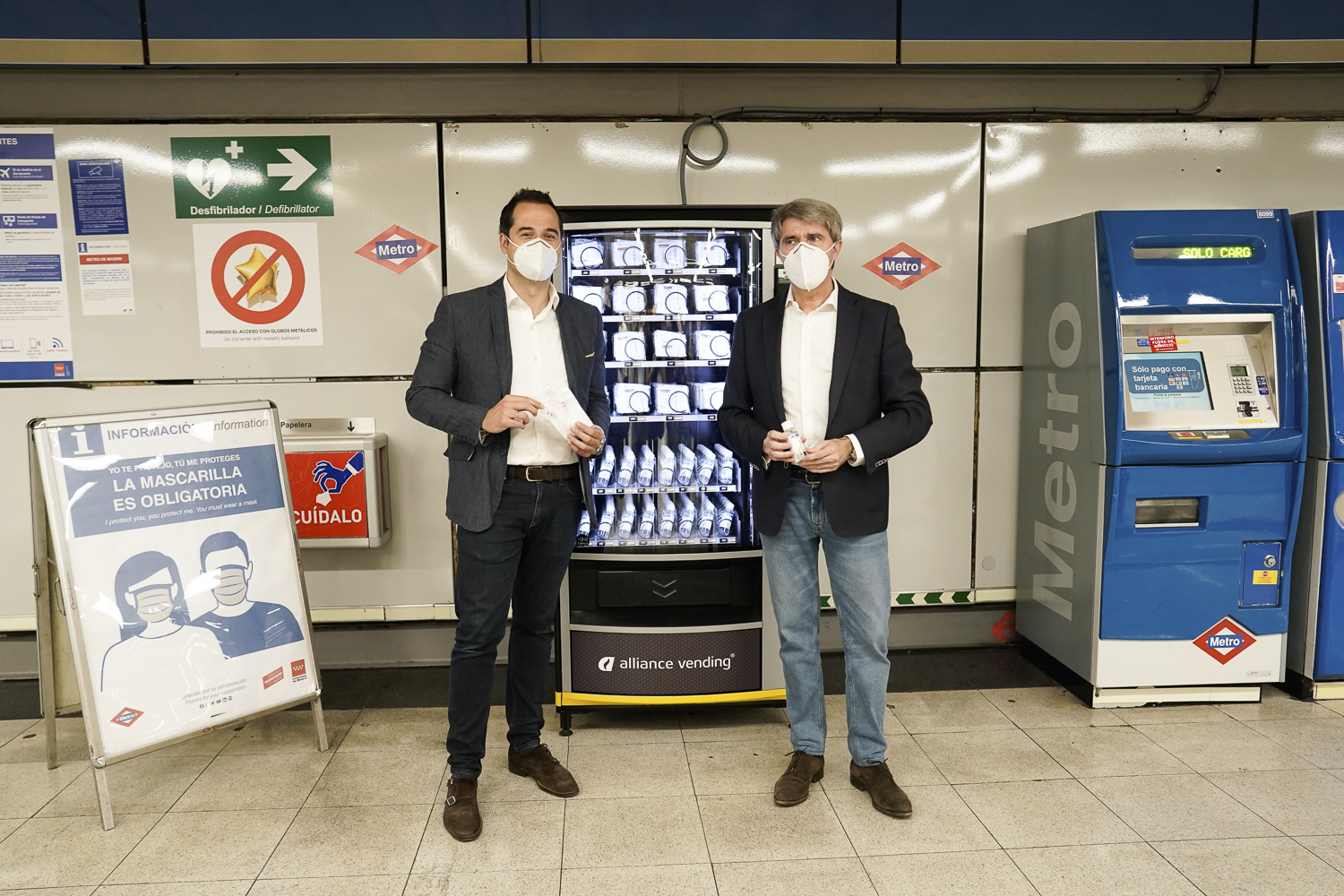 La Comunidad de Madrid va a instalar máquinas de vending con mascarillas e hidrogel en algunas de las estaciones con más afluencia de viajeros de Metro. El objetivo es facilitar la disponibilidad de estos elementos de protección, sabiendo que la mascarilla es de uso obligatorio en el transporte público. El vicepresidente, consejero de Deportes, Transparencia y portavoz del Gobierno regional, Ignacio Aguado, y el consejero de Transportes, Movilidad e Infraestructuras, Ángel Garrido, han presentado hoy la primera de estas máquinas expendedoras en la estación de Moncloa.