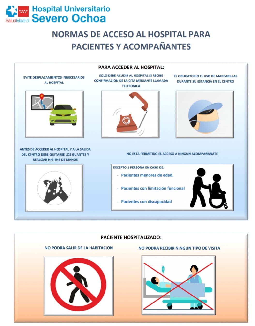 El Hospital Universitario Severo Ochoa adapta las normas de acceso al centro hospitalario tras la situación de emergencia sanitaria provocada por el COVID-19 y en consonancia directa con las medidas establecidas por la Consejería de Sanidad de la Comunidad de Madrid. Estas normas podrán ser revisadas y modificadas en el futuro en función de cómo evolucione la incidencia del coronavirus.