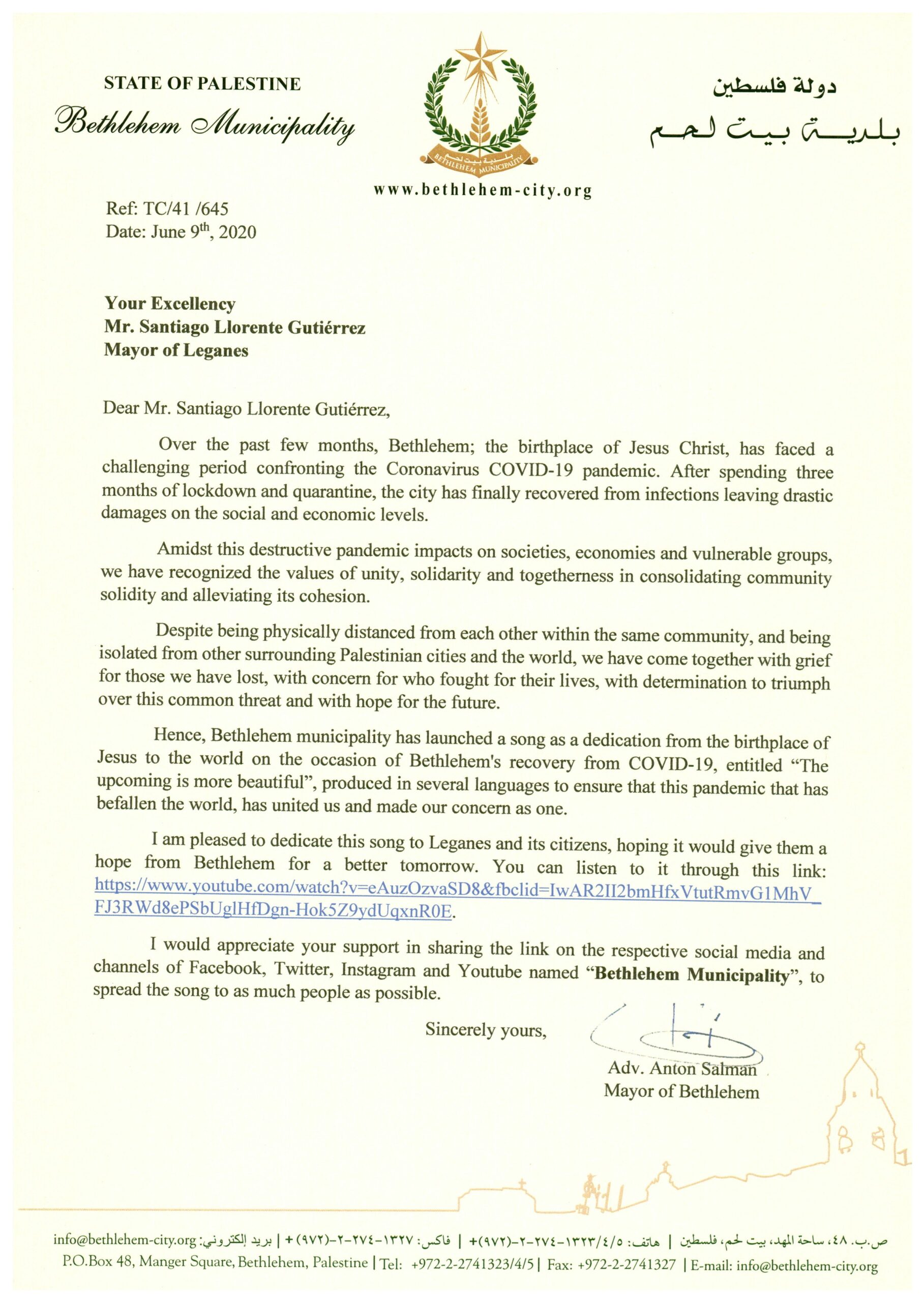 El Ayuntamiento de Leganés ha recibido durante estas semanas cartas de los alcaldes de Macará (Ecuador) y Egaleo (Grecia) y una iniciativa muy singular por parte de la ciudad palestina de Belén. Anton Salman, alcalde de Belén, ha enviado una misiva a Santiago Llorente en la que nos presenta una canción que han compuesto los ciudadanos de Belén trasladando su apoyo en estos difíciles momentos y que puede escucharse en las redes sociales del Ayuntamiento de Belén (Twitter, Facebook e Instagram) y en el Canal de Youtube del consistorio de ‘Bethlehem Municipality’.