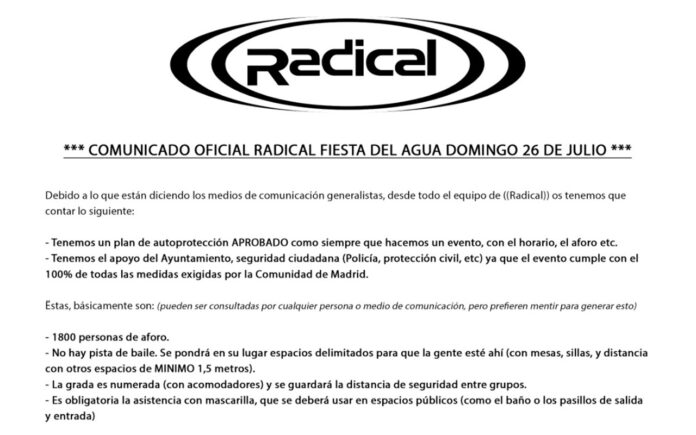 «Es imposible explicarle a los medios de comunicación que nosotros sí cumplimos las medidas de seguridad cuando nos están utilizando como cebo«. Así de tajante ha sido Radical, la empresa organizadora de la polémica Fiesta del Agua, en un comunicado en el que confirmaba la cancelación del evento, ya anunciada por el Ayuntamiento horas antes.