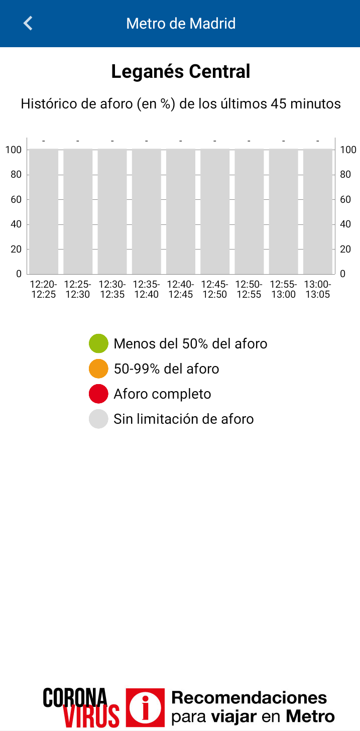 Junto a estas medidas, el suburbano también ha puesto en marcha una nueva funcionalidad de la app de Metro que indica el estado y nivel de ocupación respecto al aforo máximo permitido de las estaciones. Además, la información va acompañada de un texto que recoge el porcentaje concreto de ocupación en los últimos cinco minutos. También informa de si hay algún tipo de demora en el acceso a la estación en el momento de la consulta y el usuario puede consultar un gráfico con los datos del aforo de la estación en los últimos 45 minutos.