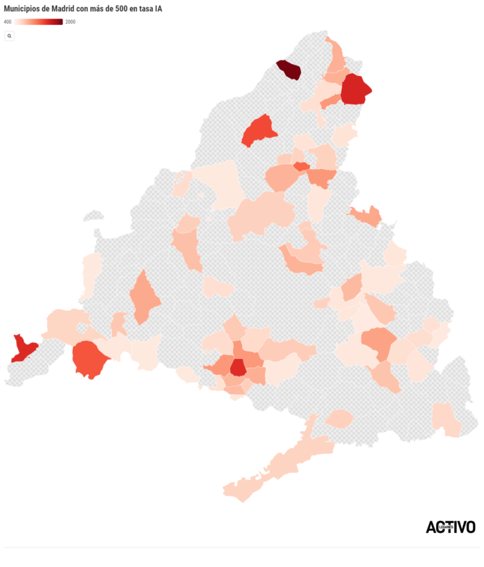 En el mapa se pueden ver las zonas que serían restringidas (en cuando a la ciudad de Madrid se ha elaborado una tasa con la suma de los casos de todos sus distritos y la población según el último censo oficial).