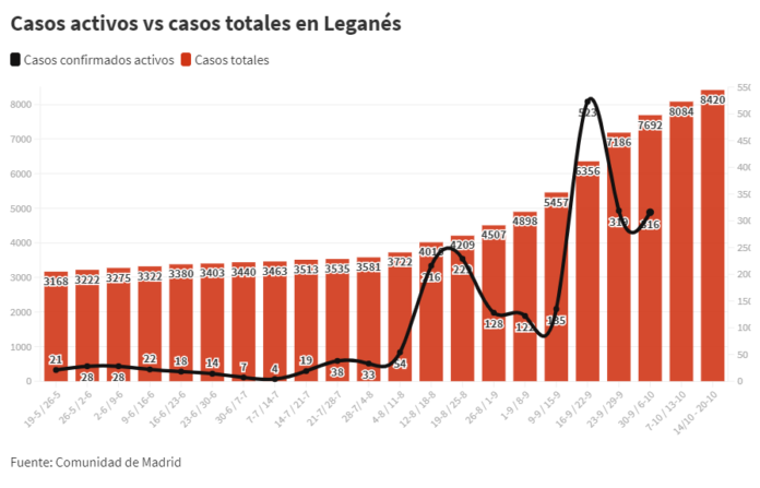 En las últimas semanas, la incidencia acumulada de coronavirus en Leganés ha bajado de forma drástica. De encontrarse por encima de los 700 casos por cada 100.000 habitantes a finales de septiembre, los datos sitúan al municipio en prácticamente la mitad de incidencia acumulada esta semana con 323 casos por cada 100.000 habitantes. Una cifra que hace referencia a la tasa de casos diagnosticados en los últimos 14 días.