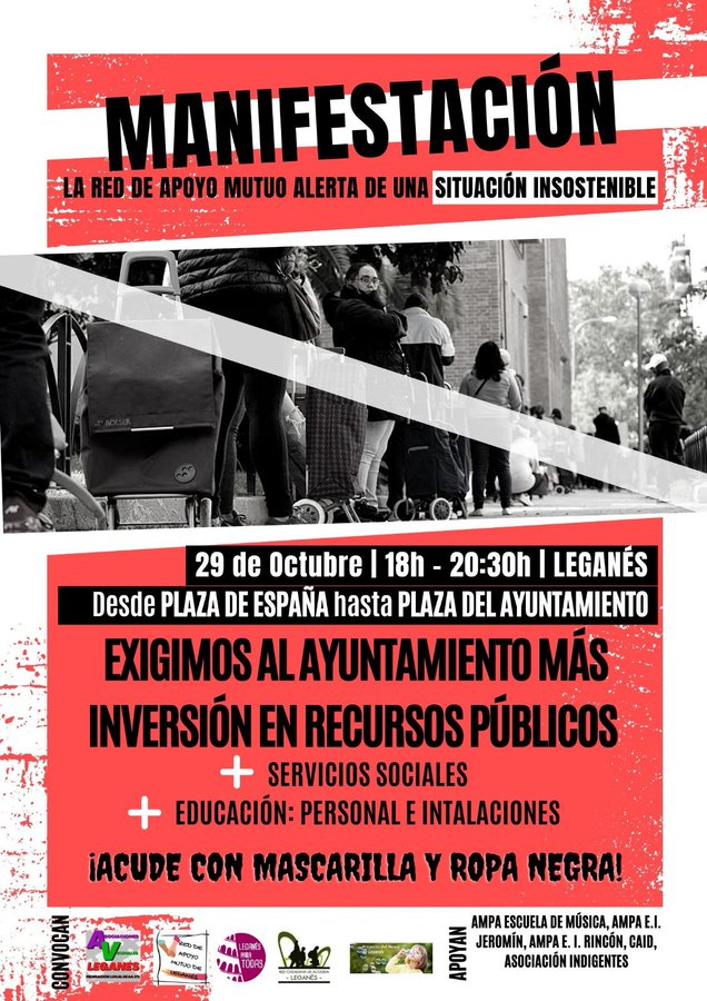 Colectivos vecinales de Leganés y la Red de Apoyo Mutuo se han unido para convocar una manifestación en Leganés en favor de un aumento de la inversión en los servicios públicos municipales. La protesta pretende poner el foco en las necesidades de los más afectados por la pandemia y la «falta de implicación del Ayuntamiento en mejorar su situación».