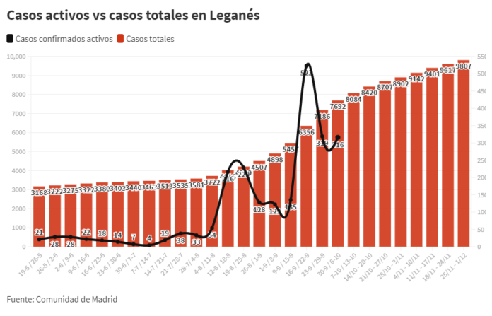 La incidencia acumulada de coronavirus en Leganés se sitúa en 181,19 casos por cada cien mil, alejándose de la franja de 400 a partir de la cual la Comunidad de Madrid interpone restricciones.