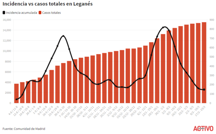 En Leganés la incidencia acumulada ha caído en un 9,18%, un porcentaje menor que el que se venía registrando desde el 26 de enero. De esta manera, en los últimos 14 días se han registrado 145,9 casos por cada 100.000 habitantes, es decir, 277 positivos; el dato más bajo de toda la zona sur de la región. En lo que llevamos de pandemia se han registrado 15.528 casos en Leganés.