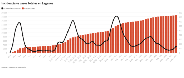 A pesar de la gran incidencia, Leganés es el gran municipio del sur con menor incidencia acumulada por debajo de los 148 de Fuenlabrada y Móstoles, los 146 de Alcorcón y los 151,9 casos por cada 100.000 habitantes en Parla.