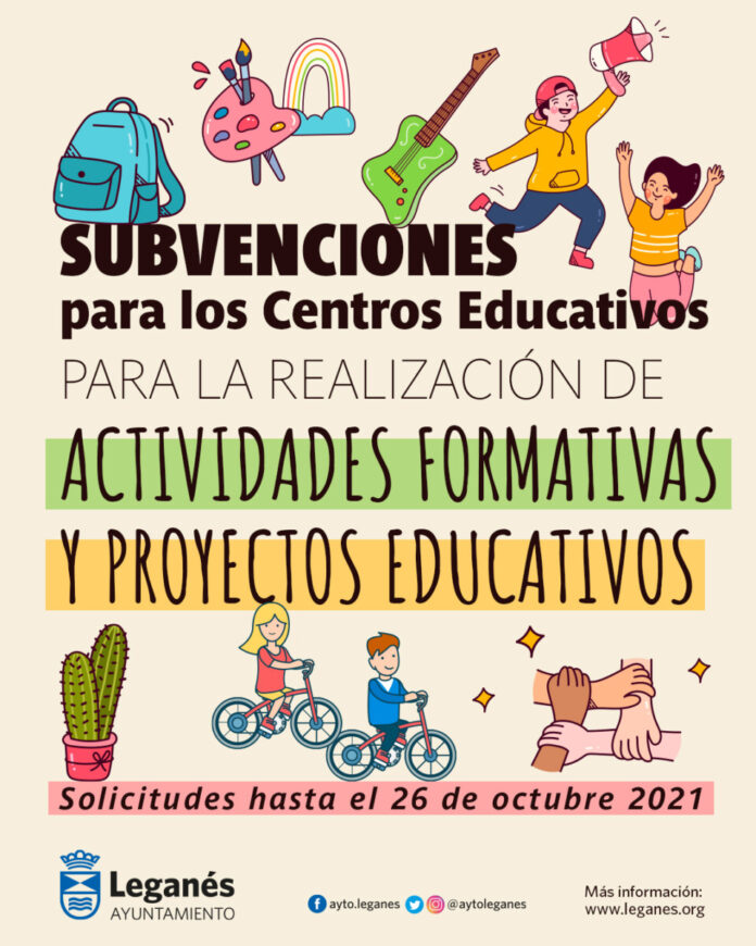 La Concejalía de Educación del Ayuntamiento de Leganés destina 500.000 euros para la subvención de proyectos educativos y actividades formativas a través de dos convocatorias de subvenciones en centros públicos y concertados de Educación Infantil, Primaria, Secundaria, Especial y de Adultos durante el curso escolar 2021-2022. El plazo de presentación de solicitudes se encuentra abierto hasta el próximo martes 26 de octubre.
