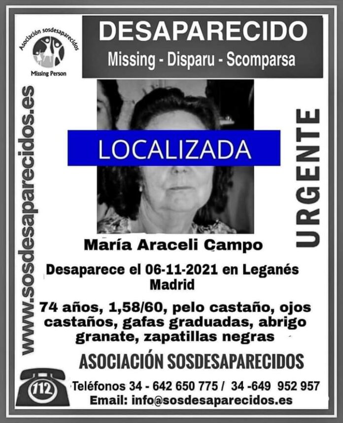 La familia de Araceli Campo ya está tranquila. La mujer se encuentra en el hospital después de haber pasado horas desaparecida. Esta vecina de Leganés había desaparecido en la madrugada del 6 de noviembre sin que sus allegados supieran dónde ha podido ir. Por ello, los familiares no dudaron en pedir ayuda a las autoridades y los vecinos a quienes les han solicitado cualquier dato que pueda ser relevante para su búsqueda.