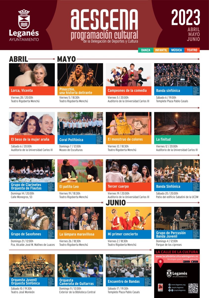 Después de meses sin programación, el Ayuntamiento de Leganés presenta la programación cultural ‘A Escena’ diseñada para los meses de abril, mayo y junio. Espectáculos gratuitos de danza, teatro, para público infantil y adulto, y música, conforman un completo programa que por fin llega a los teatros locales y que se extenderá por las calles y plazas de la ciudad para facilitar el acceso de todos los vecinos y vecinas.