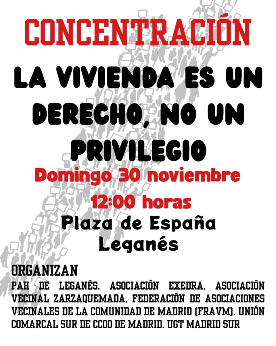 La tensión por la vivienda en Leganés vuelve a la calle. FRAMV, PAH Leganés, AV Zarzaquemada, Asociación Exedra, Unión Comarcal CCOO Madrid-Sur y UGT Madrid-Sur han convocado para este domingo 30 de noviembre una concentración en Plaza España para exigir medidas urgentes ante un mercado inmobiliario completamente desbordado. Las entidades recuerdan que Leganés es hoy el municipio donde más ha subido el precio del alquiler, con incrementos históricos, y el segundo con mayor demanda de toda España.