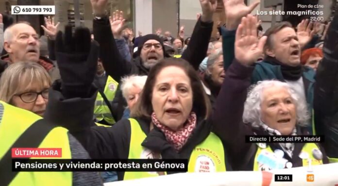 Pensionistas de Leganés, frente a la sede del PP en Génova: «Manos arriba, esto es un atraco»