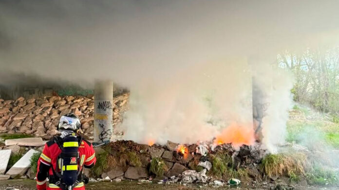Según se aprecia en la imagen, el incendio se originó en un punto con gran acumulación de residuos: plásticos, muebles, escombros y restos abandonados. Un escenario habitual en este tipo de enclaves, donde la falta de control y limpieza convierte cualquier chispa en un incendio potencial.
